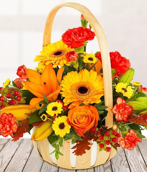 An Autumn Basket full of autumnal flowers with the orange and deep red hues of one of our favourite seasons. A lovely collection of autumn flowers arranged in a basket, the perfect gift.