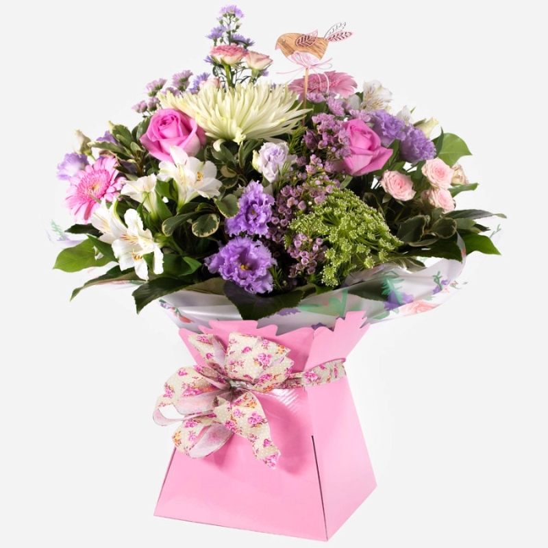 A gorgeous hand-tied bouquet in sweet pastel shades, filled with beautiful blooms to brighten any day.
